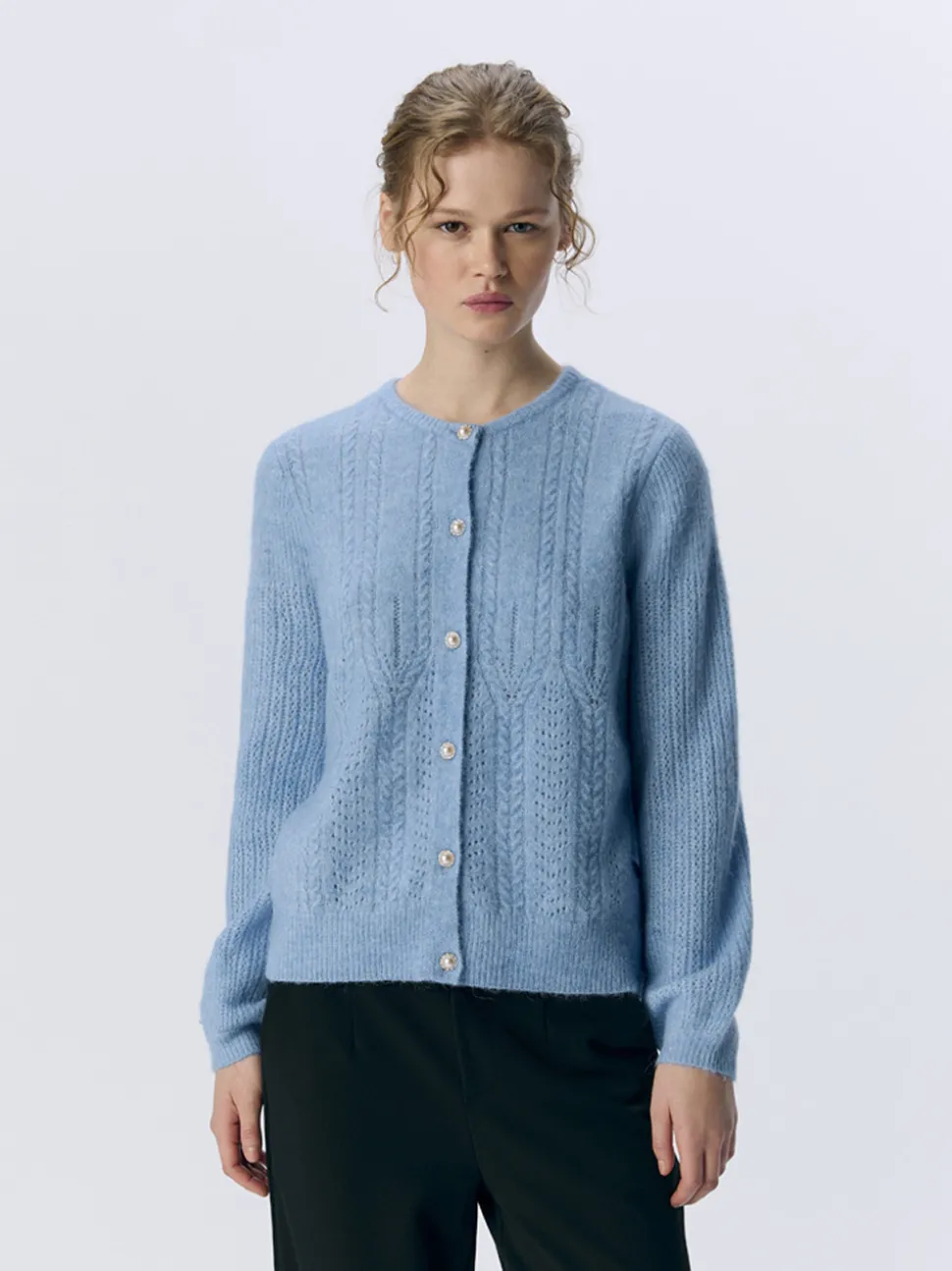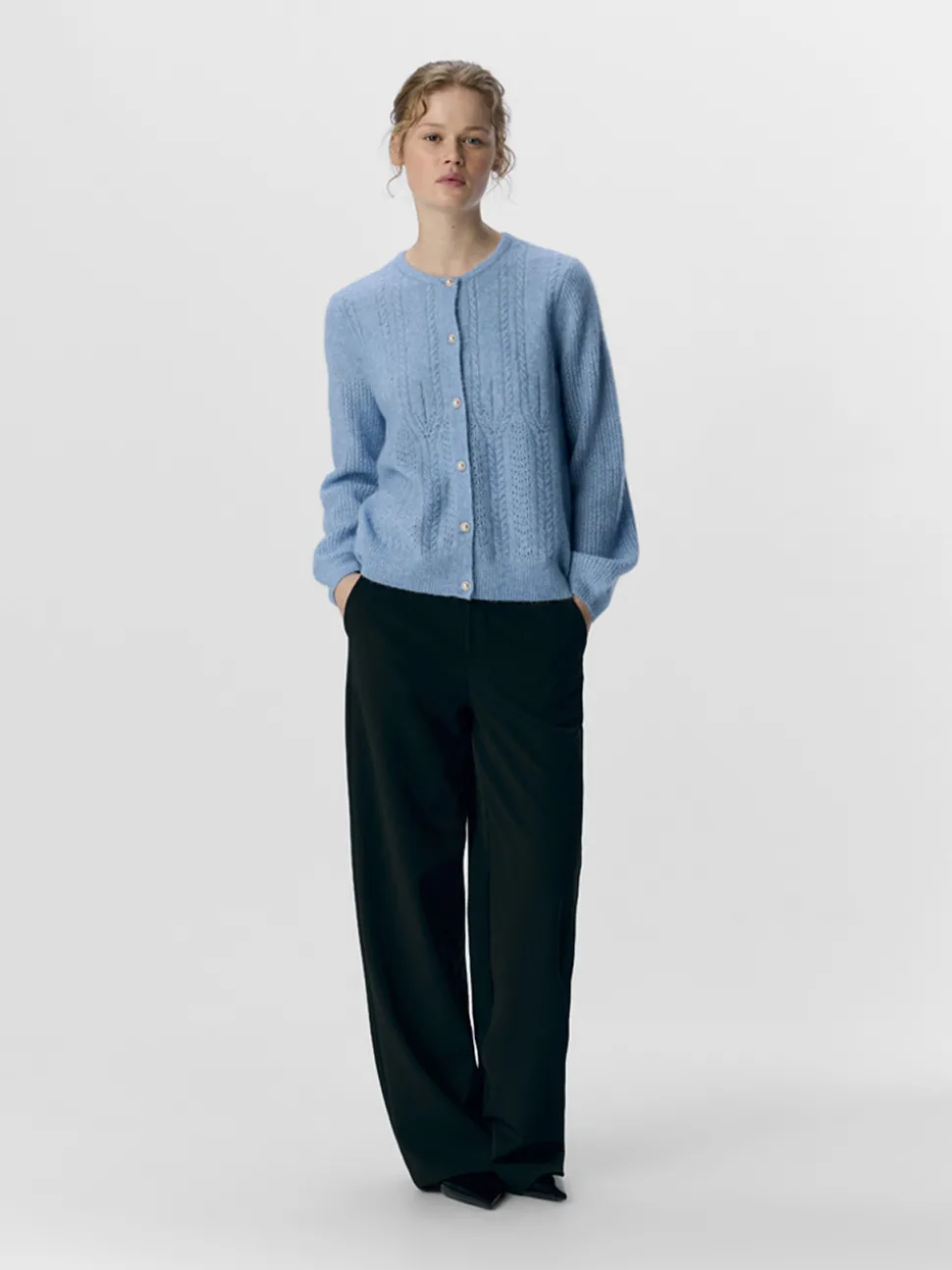 Ophelia LS Knit Cardigan fra Object. Fin cardigan i lett strukturstrikk som går til det meste. Den har rund hals, ballongermer og knappelukking i front.